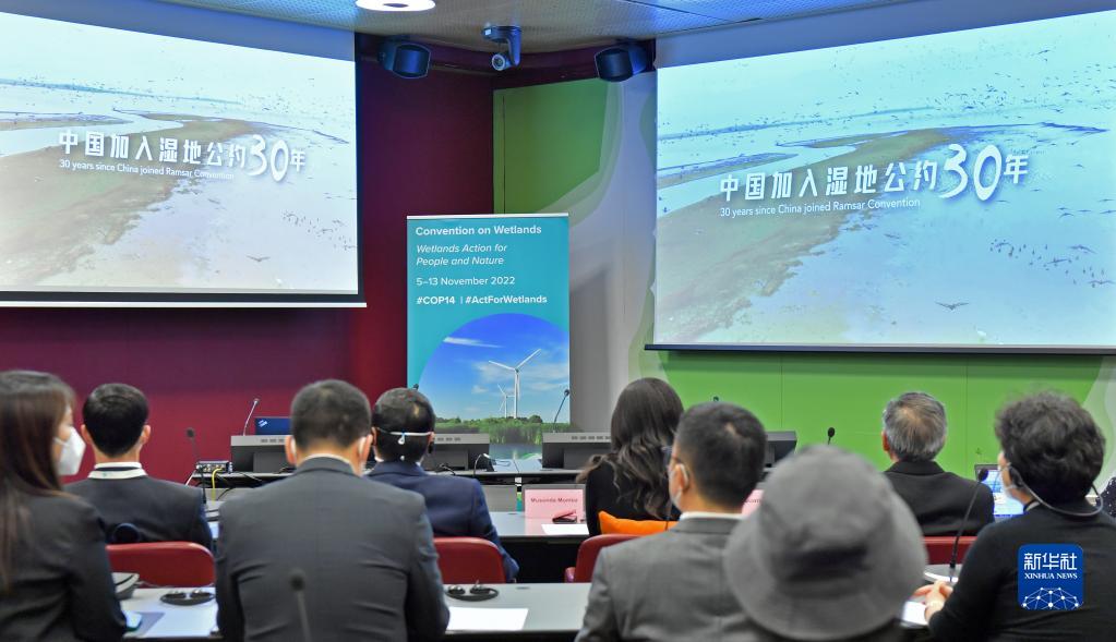 這是11月10日在瑞士日內瓦拍攝的“《濕地公約》履約30周年——中國濕地保護與合理利用成就”主題邊會會場。