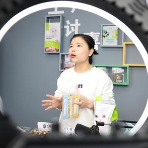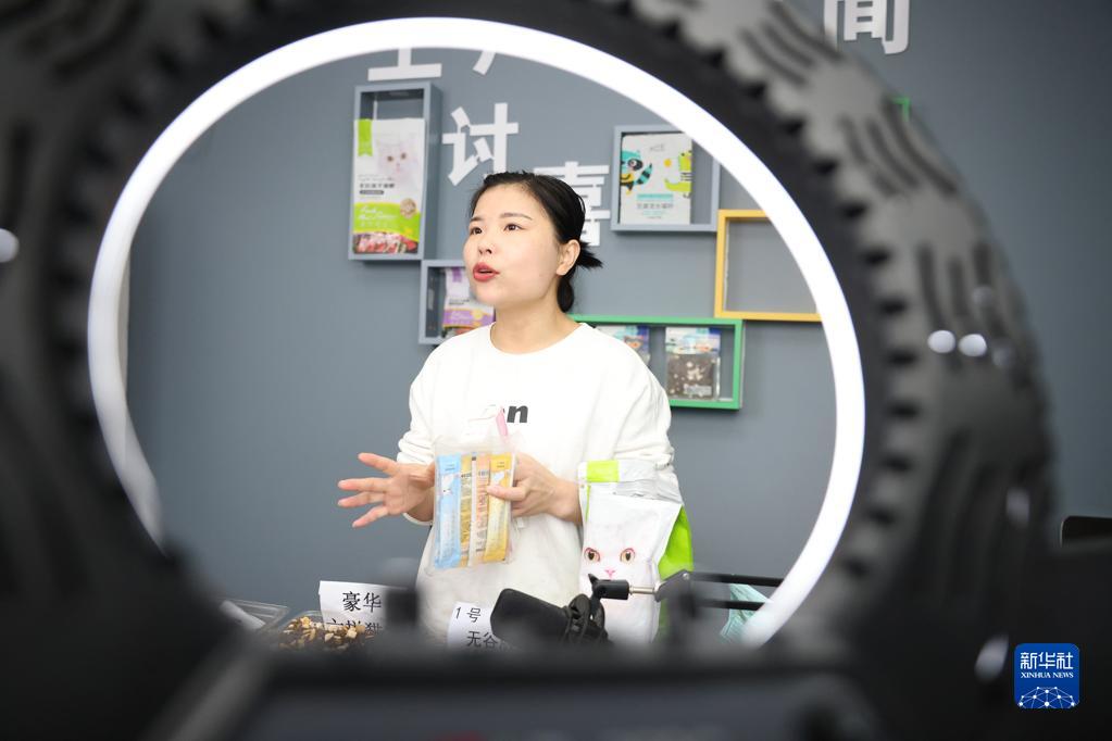11月11日,在邢臺市南和區賈宋鎮一家寵物電商企業,主播通過直播的方式銷售寵物食品。