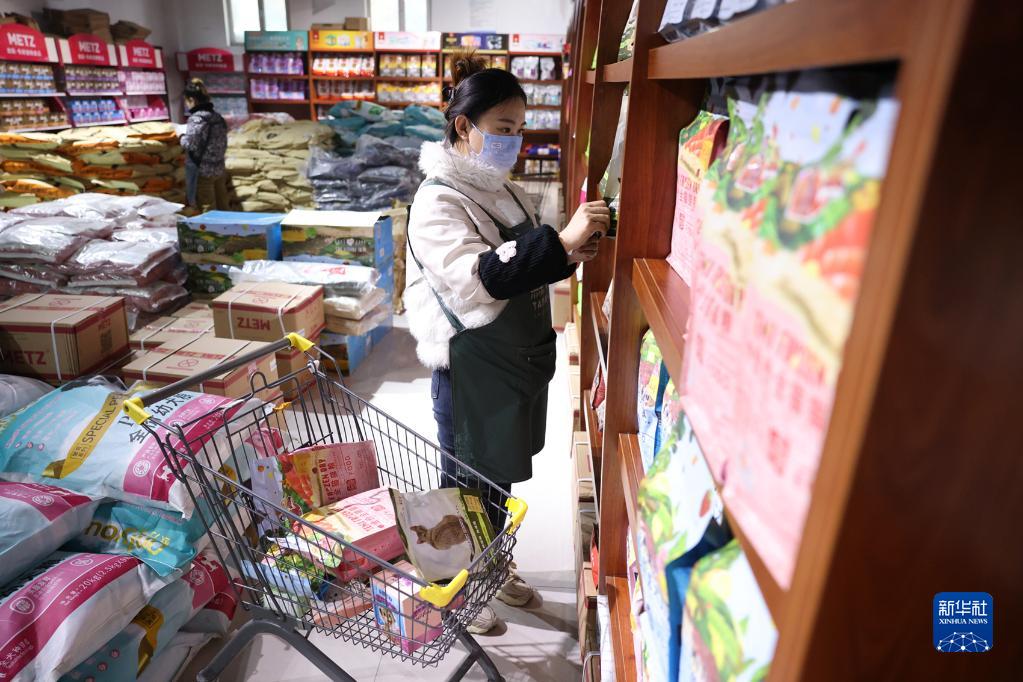 11月11日,在邢臺市南和區和陽鎮一家寵物電商企業,工作人員在給客戶選配寵物食品。