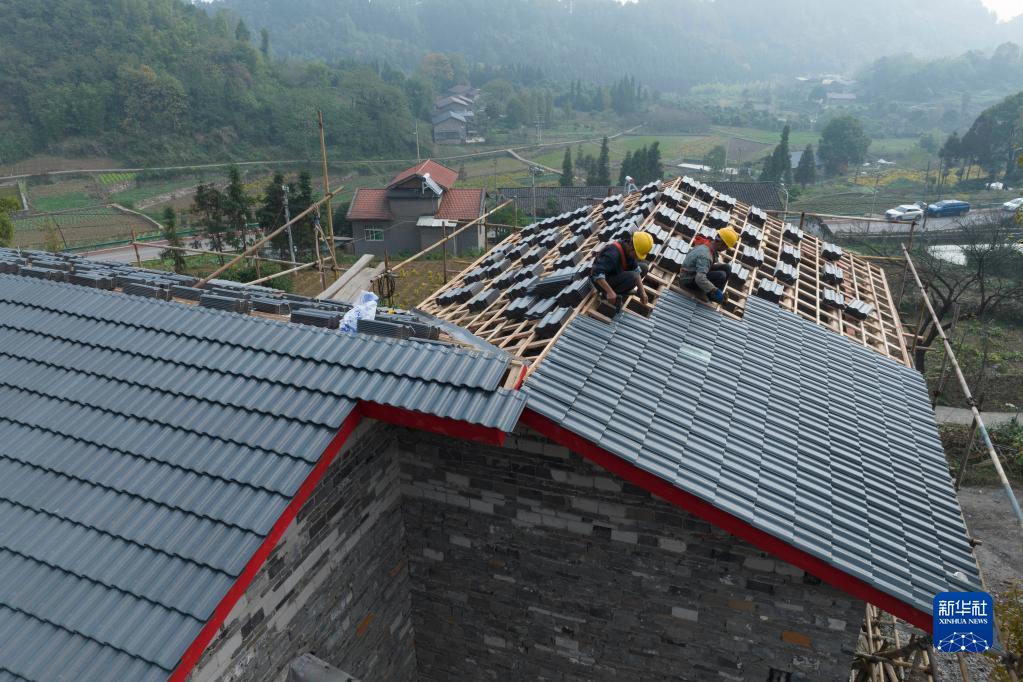 11月11日,在重慶市北碚天府鎮,施工人員在對農房進行屋頂更換作業(無人機照片)。