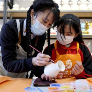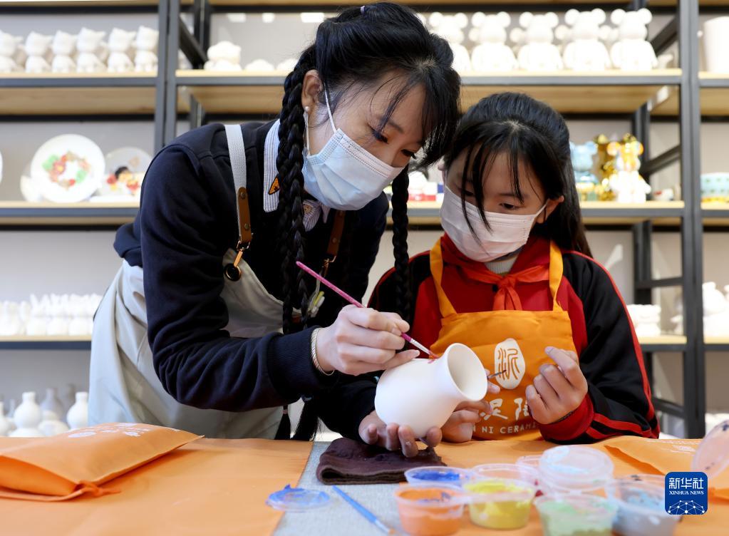 11月11日,江蘇省徐州市漢王鎮紫山村春泥陶藝的老師(左)在陶藝教室向學生講解彩陶繪陶的有關知識。