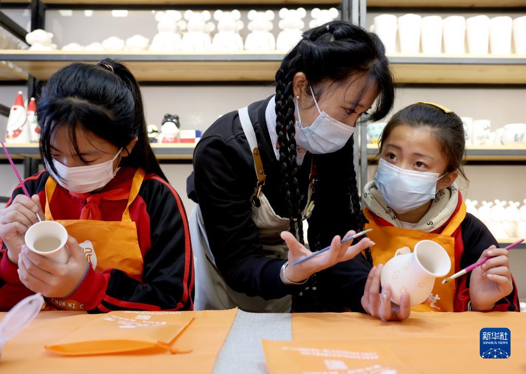 11月11日,江蘇省徐州市漢王鎮紫山村春泥陶藝的老師(中)在陶藝教室向學生講解彩陶繪陶的有關知識。