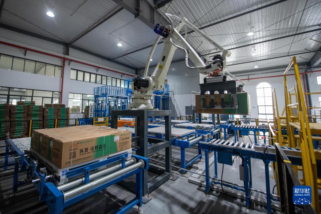 11月2日,在紹興誠邦高新纖維科技有限公司自動化車間內,機械臂在運輸裝箱完畢的化纖材料。