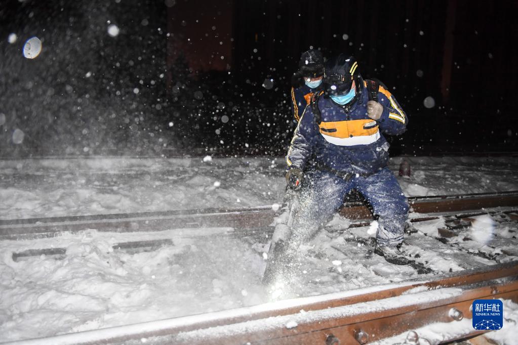 11月13日,在長春火車站,中國鐵路沈陽局集團有限公司長春站工作人員清理鐵軌上的積雪。