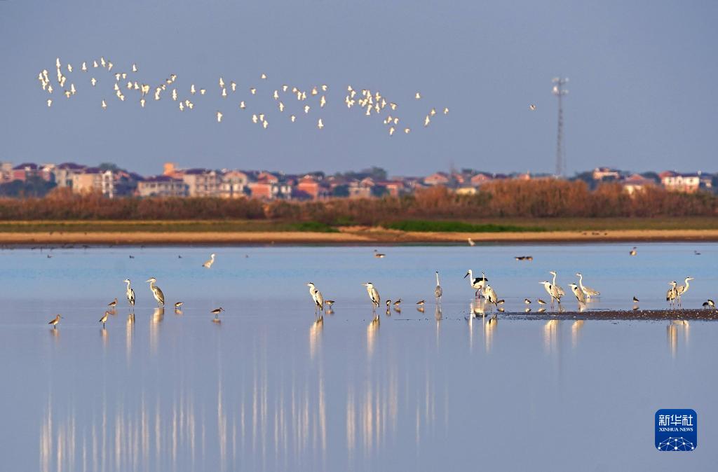 11月11日,眾多候鳥在江西鄱陽湖南磯濕地國家級自然保護區的濕地棲息。