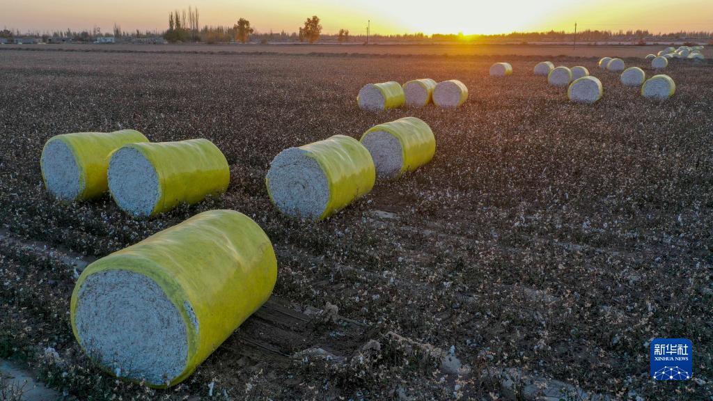 在新疆沙雅縣海樓鎮一處棉田里拍攝的打包完成的棉花(11月10日,無人機照片)。