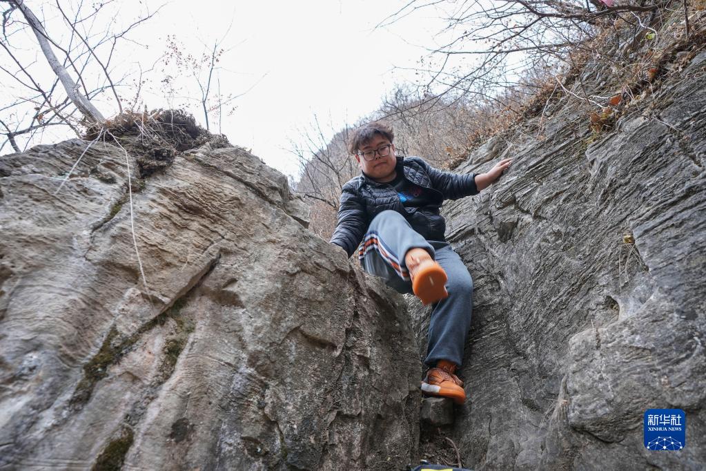 保護區工作人員張笑晨在途中攀爬山石(11月9日攝)。