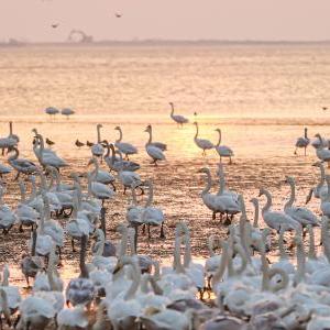 近日,大批大天鵝飛抵山東省榮成市成山鎮天鵝湖濕地棲息越冬,場面蔚為壯觀,吸引眾多游客前來欣賞。