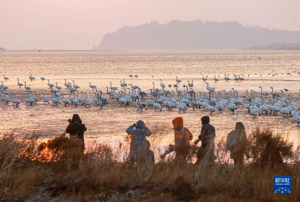 近日,大批大天鵝飛抵山東省榮成市成山鎮天鵝湖濕地棲息越冬,場面蔚為壯觀,吸引眾多游客前來欣賞。