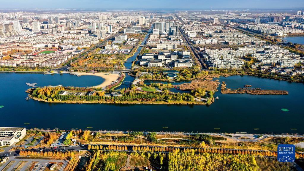 東營市明月湖國家城市濕地公園景色(11月13日攝,無人機照片)。