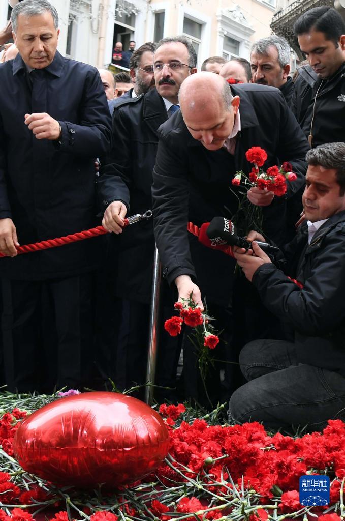 11月14日,土耳其內政部長索伊盧在伊斯坦布爾市中心塔克西姆廣場邊的獨立大街爆炸現場獻花以表哀悼之情。
