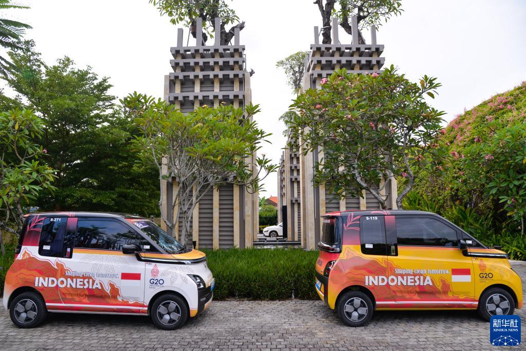 這是11月12日在印度尼西亞巴厘島G20峰會主會場拍攝的五菱新能源車。