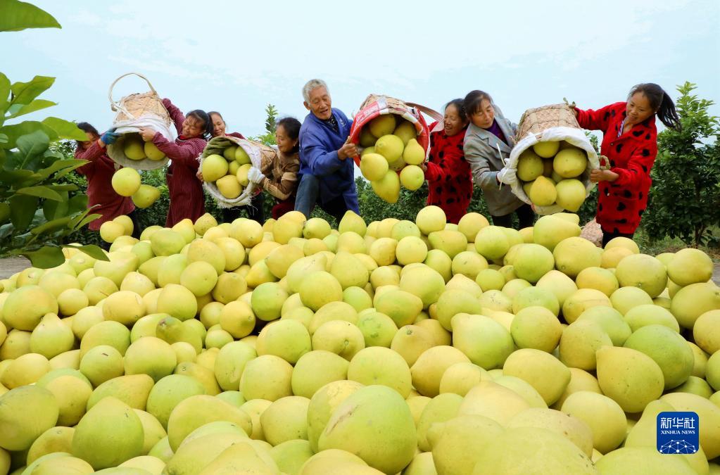 11月14日,四川省眉山市仁壽縣汪洋鎮五愛村蜜柚種植基地,村民在搬運蜜柚。