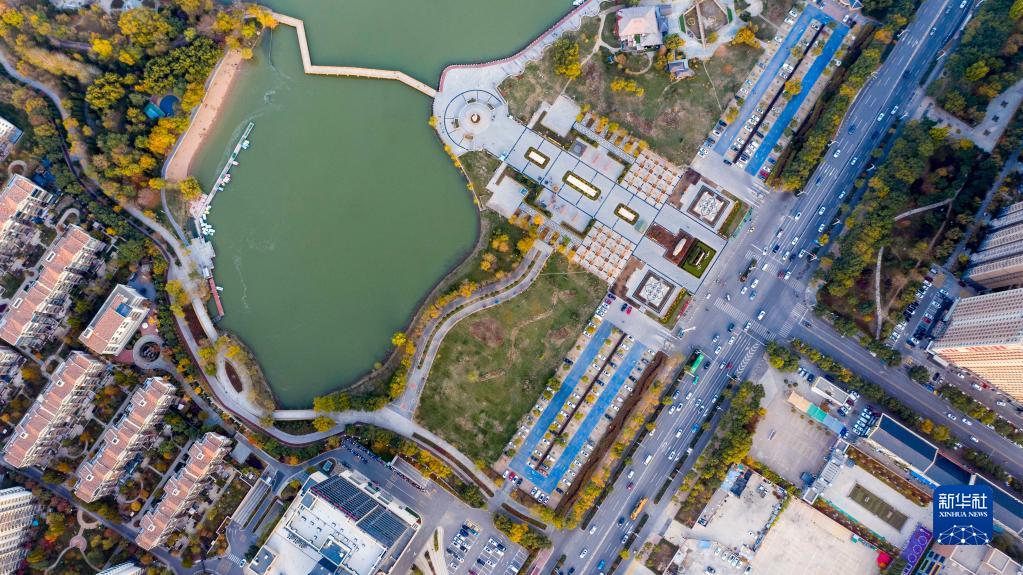 這是2022年11月1日拍攝的寧夏銀川市寶湖國家城市濕地公園一角(無人機照片)。