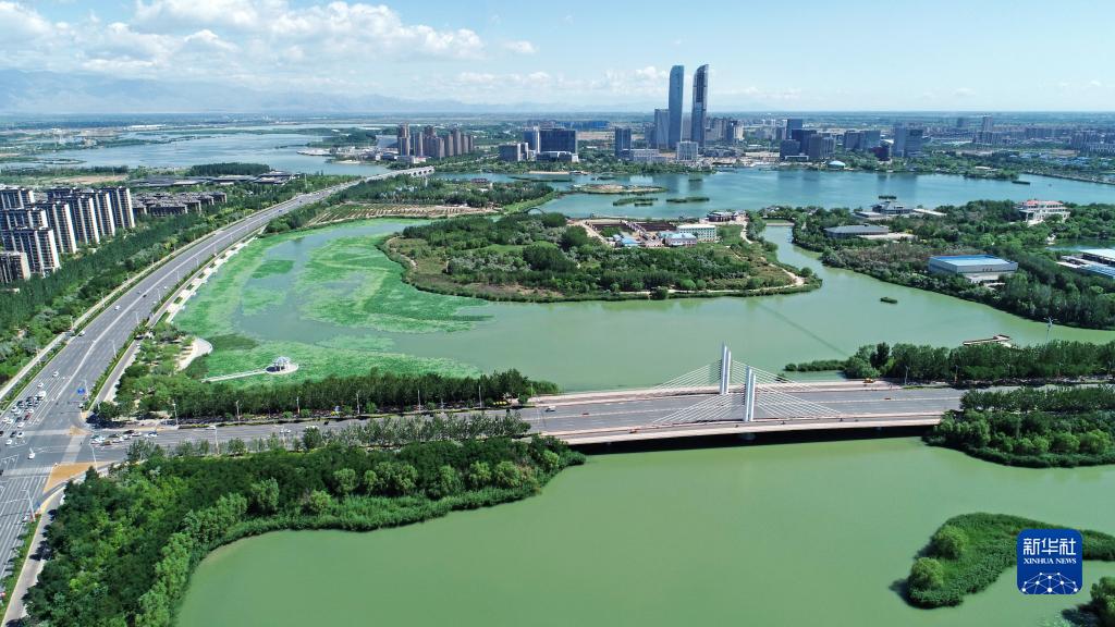 寧夏銀川市閱海國家濕地公園一景(2022年6月27日攝,無人機照片)。