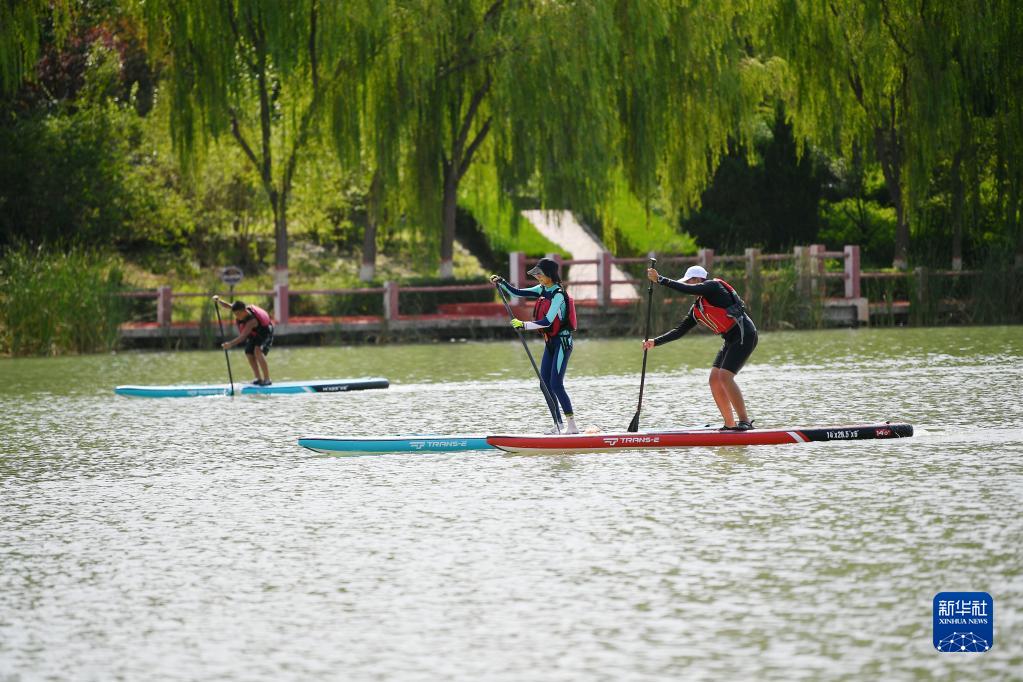 市民在寧夏銀川市典農河上休閑運動(2022年8月7日攝)。