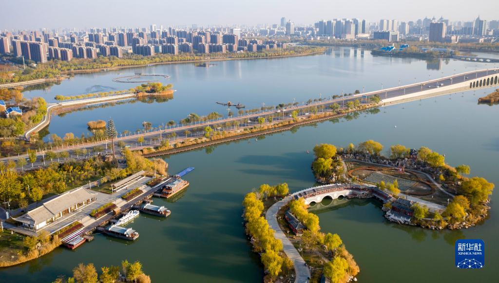 寧夏銀川市閱海國家濕地公園一景(2022年11月1日攝,無人機照片)。