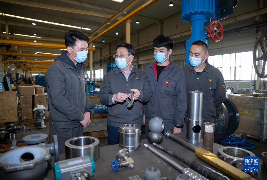 在位于寧夏吳忠市的吳忠儀表有限責任公司自動化產業園數字化裝配車間內,馬玉山(左二)與技術人員交流(11月12日攝)。