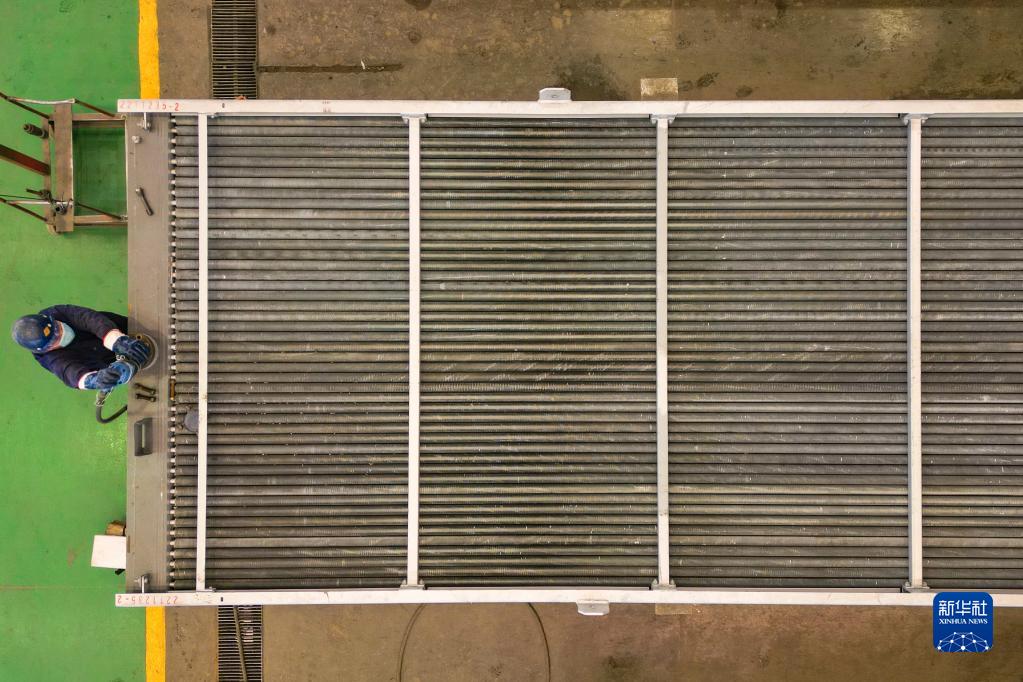 11月15日,工人在哈爾濱空調股份有限公司生產車間內作業(無人機照片)。