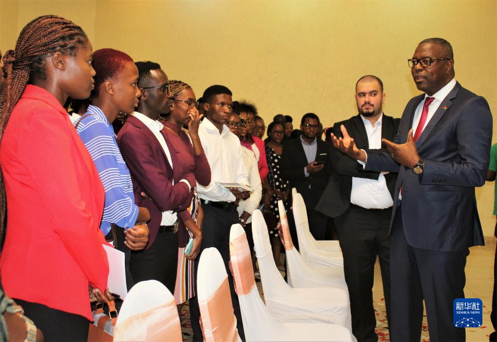 11月14日,在馬拉維首都利隆圭,馬拉維信息和數字化部長卡扎科(右一)與學員代表交流。