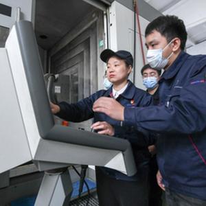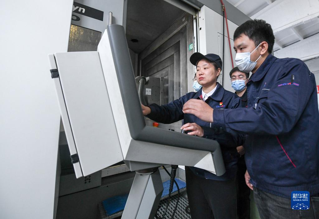 在哈爾濱東安汽車動力股份有限公司增程動力系統研究院加工中心,苗秀(左)與工作室成員共同操作機床(11月15日攝)。