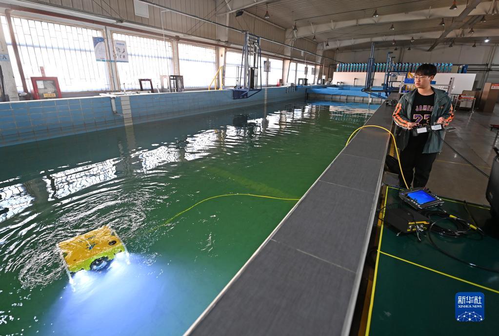 11月16日,在位于天津市濱海新區的深之藍海洋科技股份有限公司,工作人員測試水下機器人產品。