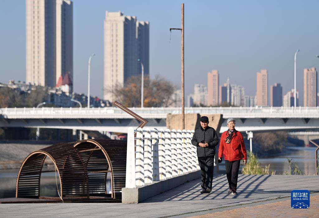 兩位老人在天津市紅橋區子牙河濱河公園內散步(11月15日攝)。