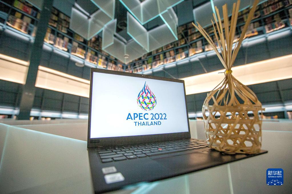 這是11月5日在泰國曼谷朱拉隆功大學拍攝的2022年亞太經合組織會議會標和泰國傳統竹編器皿“插隆”。