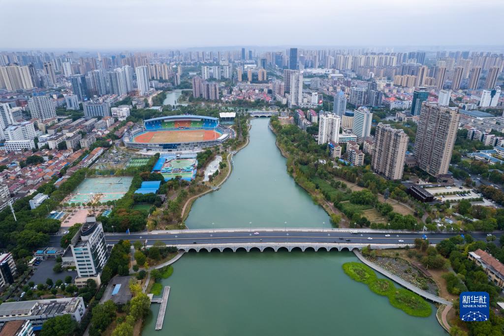 這是11月12日在常德城區拍攝的穿紫河生態治理工程及周邊景色(無人機照片)。 新華社記者陳思汗攝