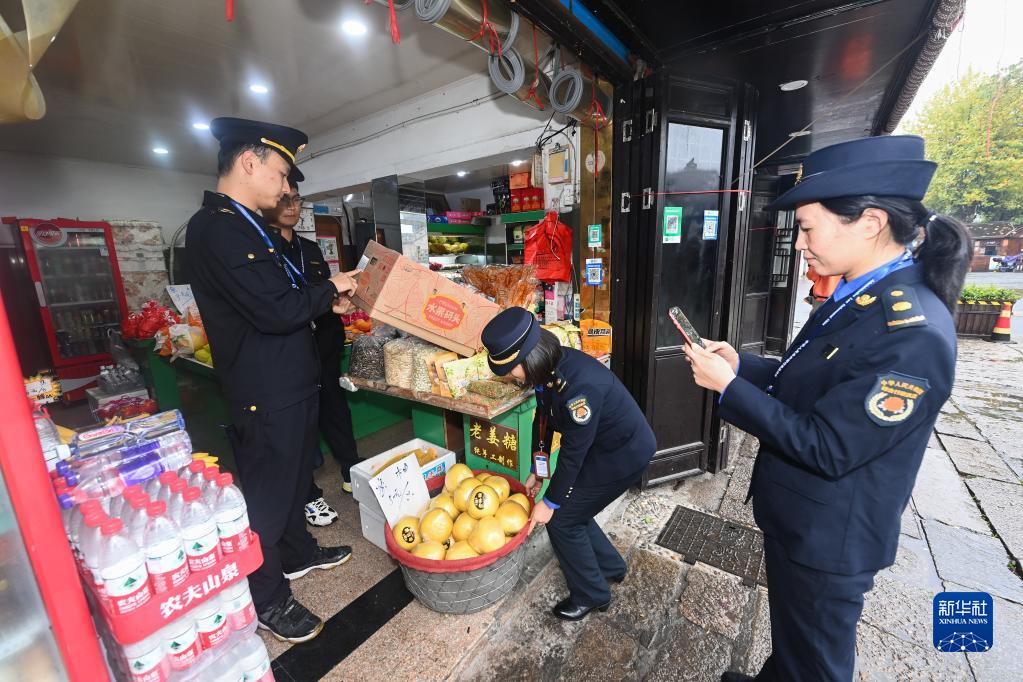 11月17日,湖州市南潯區南潯鎮綜合行政執法隊的市場監管工作人員和行政執法工作人員在南潯古鎮景區的商業街上進行“綜合查一次”檢查。