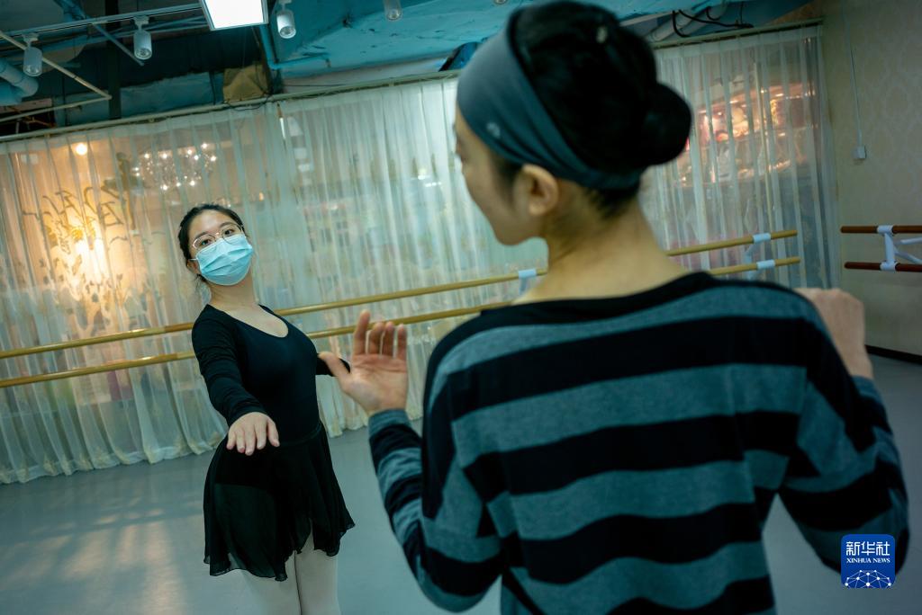 11月16日,在北京的舞蹈教室,趙蘊輝(右)指導一名同事的舞蹈動作。為了不斷提高教學水平,趙蘊輝每周三都帶領“蘊輝芭蕾”的老師們開展教研。 新華社記者 劉金海 攝