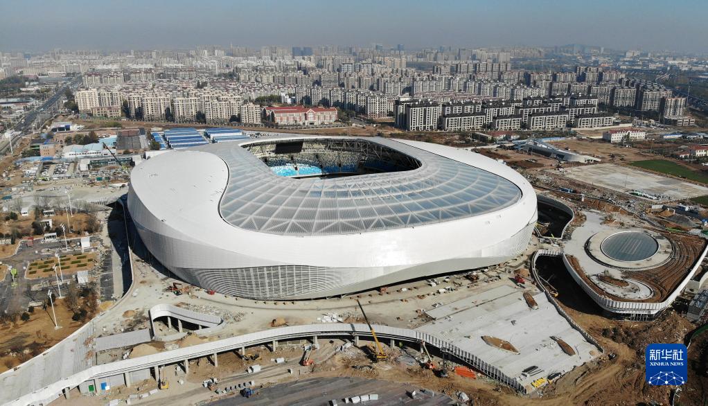 正在建設中的青島青春足球場位于青島市城陽區靖城路東側,該足球場采用索承網格+ETFE膜相結合(11月16日攝,無人機照片)。