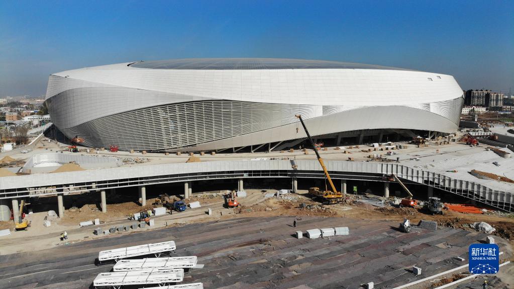 正在建設中的青島青春足球場,該足球場外墻設計靈感由海而來,取意“躍動海浪”(11月16日攝,無人機照片)。