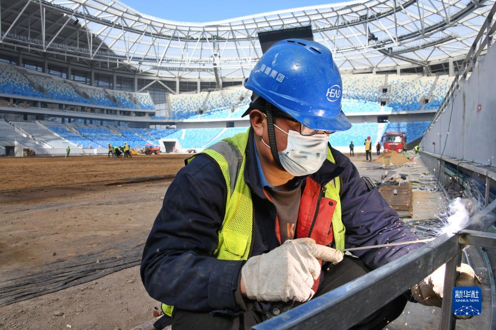 青島青春足球內場,工人在進行焊接作業(11月16日攝)。