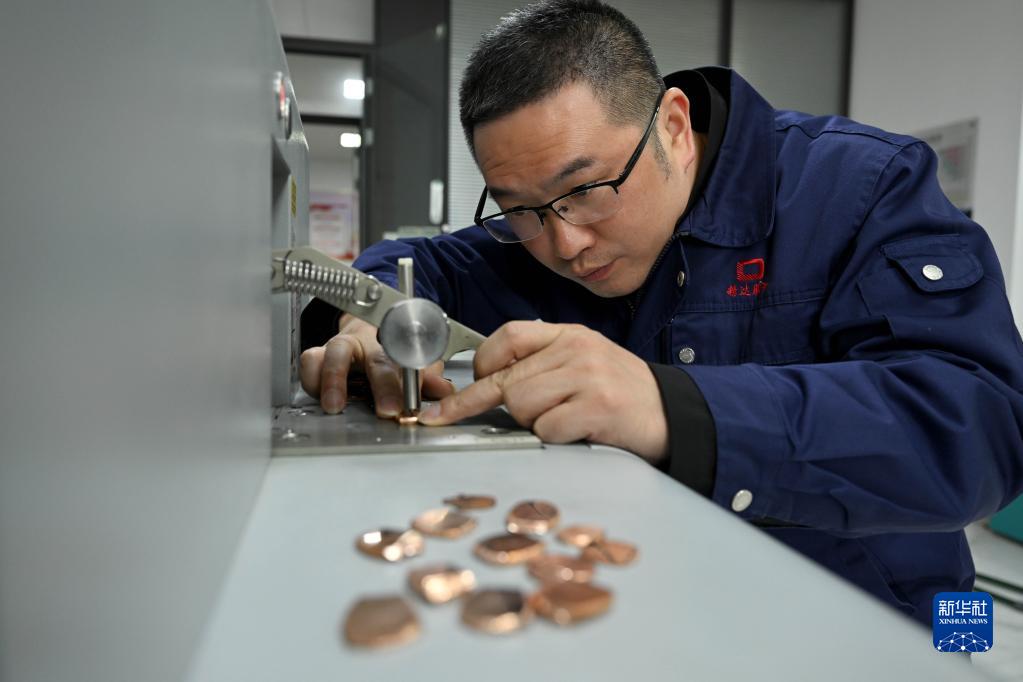 11月16日,在位于安徽省銅陵市的銅陵精達特種電磁線股份有限公司實驗室,蘇保信操作直讀光譜儀分析銅原料的雜質成分。
