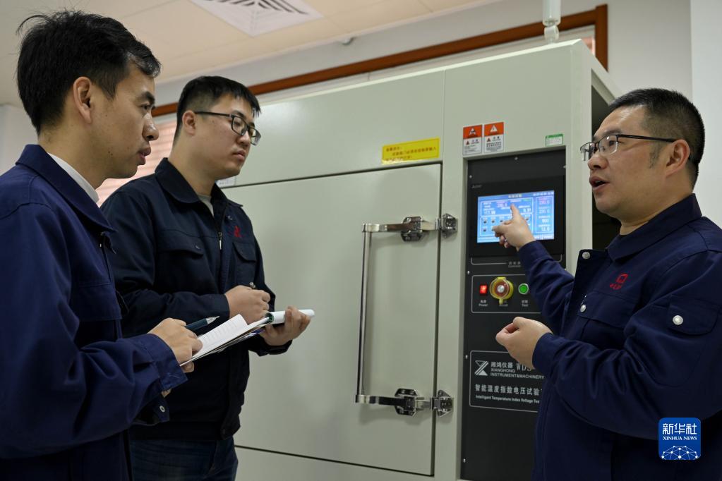 11月16日,在位于安徽省銅陵市的銅陵精達特種電磁線股份有限公司實驗室,蘇保信(右)為工作人員講解熱老化耐壓試驗儀的操作規程。
