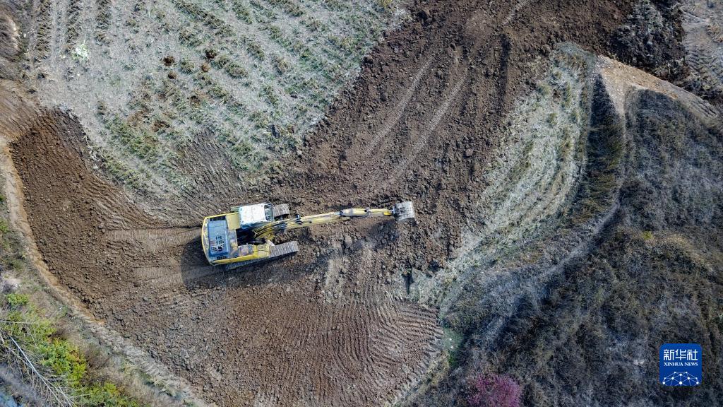 11月17日,在湘潭市湘鄉市梅橋鎮梅橋村,工人使用機械平整土地(無人機照片)。