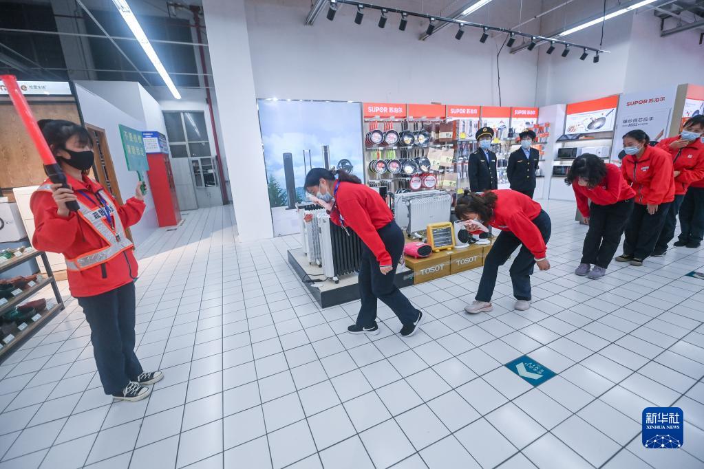 11月17日,超市疏散引導人員(左一)在現場演練中引導人們有序疏散。