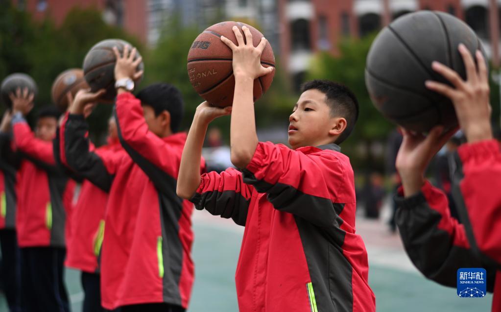11月17日,學生在貴州省遵義市第四十中學操場練習籃球。