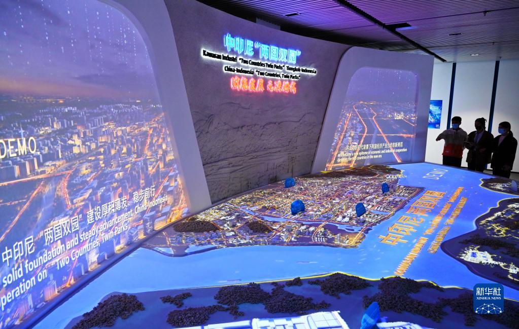 11月16日拍攝的福州元洪投資區元洪食品數字經濟產業中心的中印尼“兩國雙園”沙盤和項目介紹。