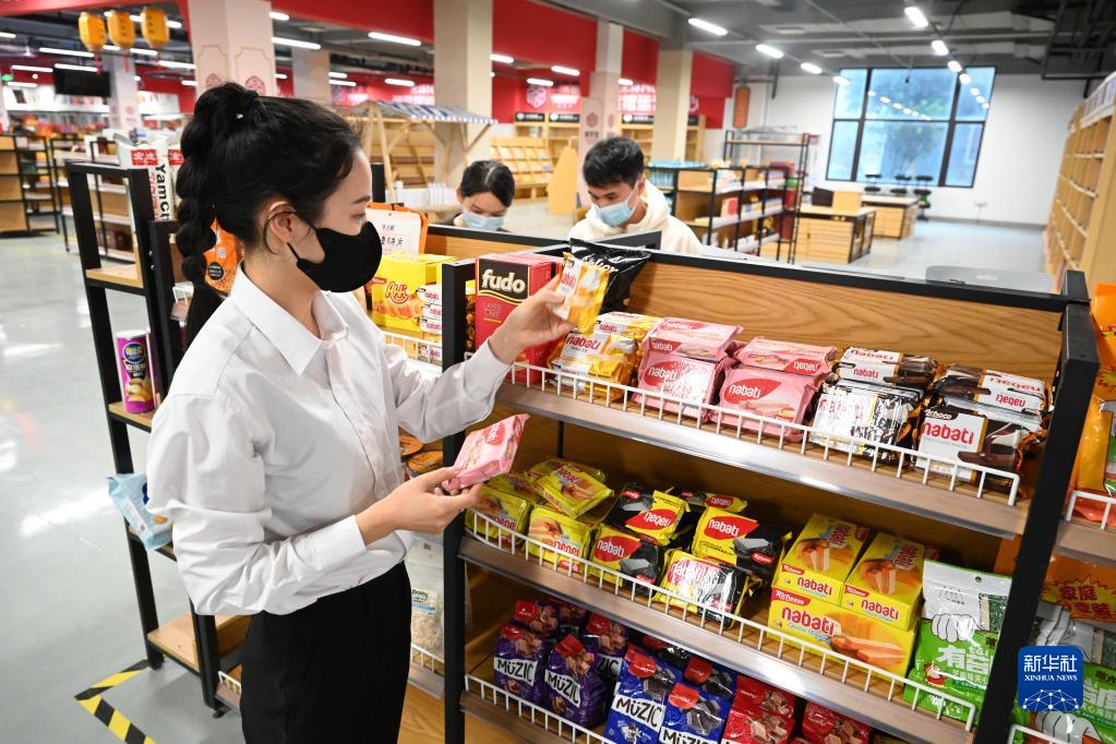 11月16日,參觀者在福州元洪投資區元洪食品數字經濟產業中心的元洪在線展示體驗中心選購印尼食品。