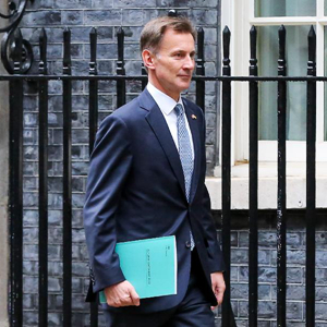 11月17日,在英國倫敦,英國財政大臣杰里米·亨特離開辦公室,準備前往議會公布秋季預算案。