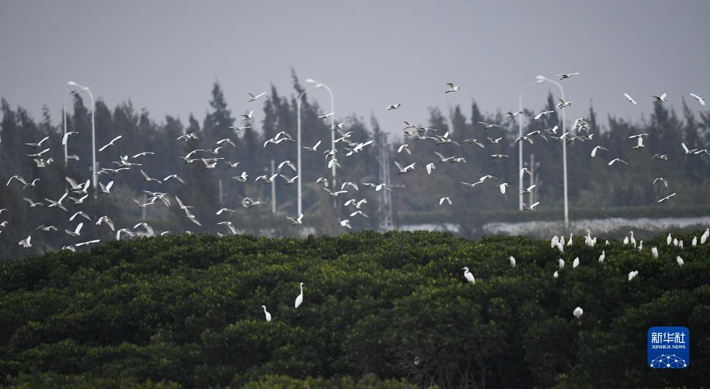 鷺鳥在海南東寨港國家級自然保護區內起飛(2022年1月28日攝)。