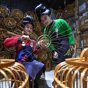 在貴州省丹寨縣龍泉鎮卡拉村的鳥籠文創工坊,苗族手工藝人在編制鳥籠(11月16日攝)。