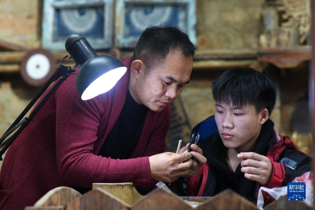 在貴州省丹寨縣龍泉鎮卡拉村的銀飾鍛造工坊,苗族手工藝人(左)在指導學徒如何選擇制作銀制器具的工具(11月16日攝)。