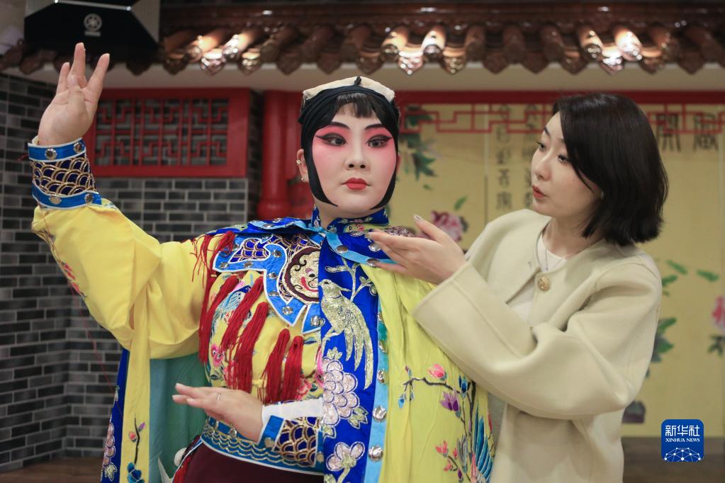 11月14日,沈陽京劇院老師劉暢(右)指導明亮學習京劇《霸王別姬》。