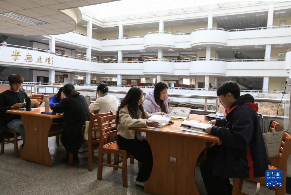 11月16日,李文龍(右一)、明亮(右二)和白書晴(右三)在圖書館查閱京劇相關資料書籍。
