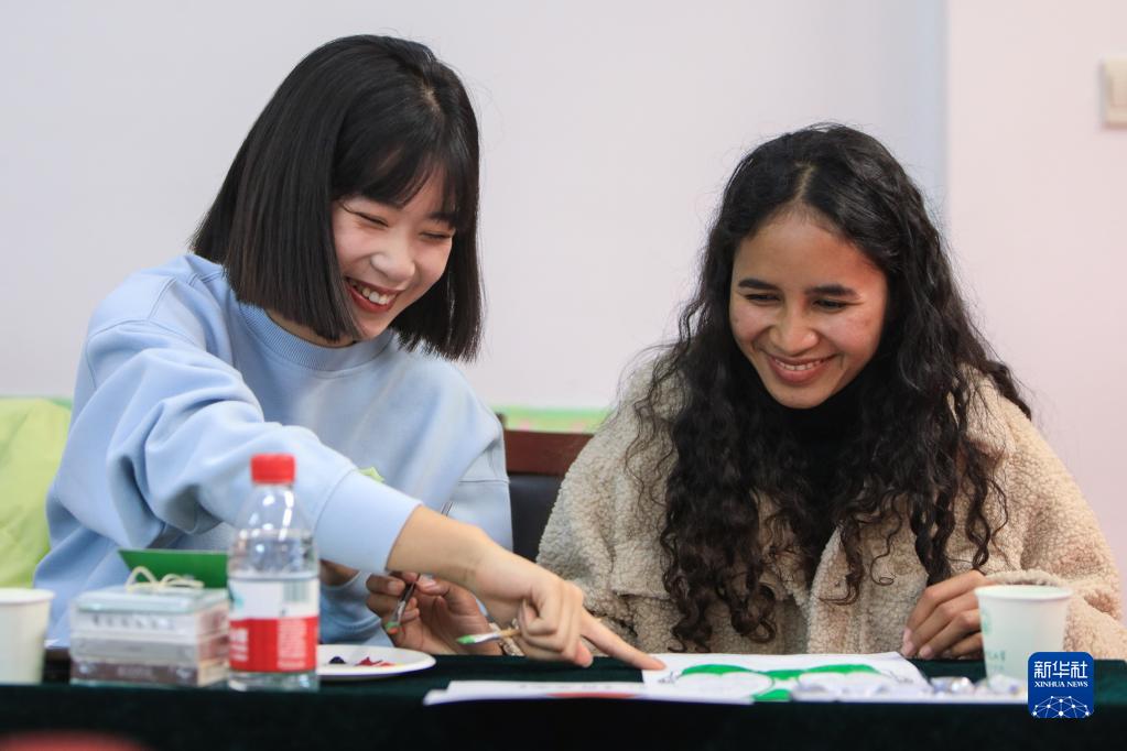 11月16日,白書晴(右)在學校社團活動上與中國學生交流。