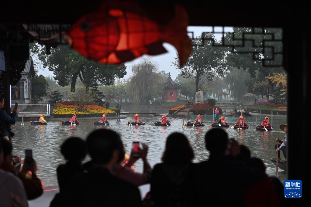 11月18日,和孚鎮荻港村村民在水上進行歡慶豐收的民俗表演。