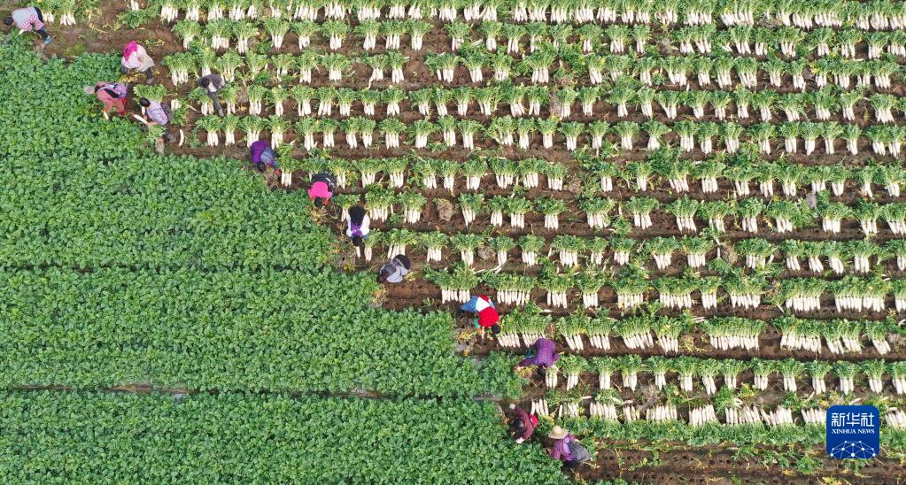 11月18日,在四川眉山市青神縣青竹街道沙河村蔬菜基地,村民在采收白蘿卜(無人機照片)。